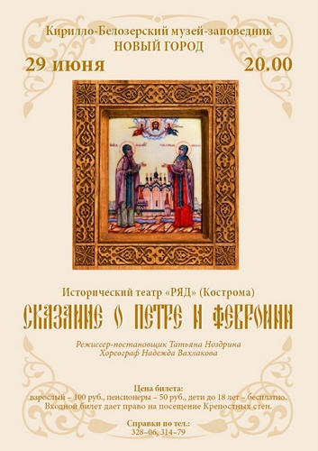 Кирилло-Белозерский музей приглашает вологжан 29 июня на акцию «Белые ночи в музее». В 20 часов в музее на территории Нового города состоится выступление исторического театра «РЯД» из Костромы, который покажет спектакль под открытым небом «Сказание о Петре и Февронии». Цена билета: взрослый – 100 руб., льготный для пенсионеров – 50 руб., дети до 18 лет – бесплатно.
