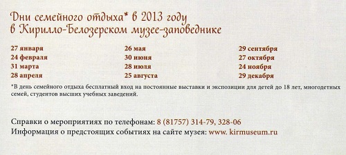 Напоминаем посетителям о том, что последнее воскресенье каждого месяца в музее объявлено Днем семейного отдыха. В июне День семейного отдыха пройдет уже на этой неделе – 30 числа. Для детей до 18 лет, многодетных семей и студентов высших учебных заведений вход на выставки и экспозиции, Колокольню и галереи Крепостных стен бесплатный.