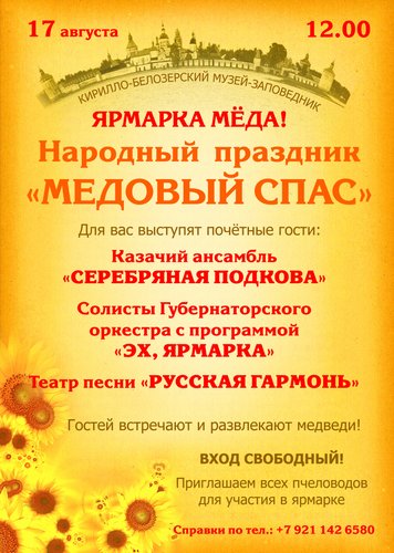 Приглашаем жителей и гостей города взрослых и детей в музей-заповедник на ЯРМАРКУ МЁДА (мёд представят кирилловские и вологодские промысловики). Особо просим пчеловодов нашего района принять участие в ярмарке (тел. для справок: +7 921 1426580). Праздник в музее состоится в любую погоду! В дождь зрители смогут разместиться на Крепостных стенах и оттуда смотреть выступления артистов. Вход на праздник – свободный. Начало в 12 часов!